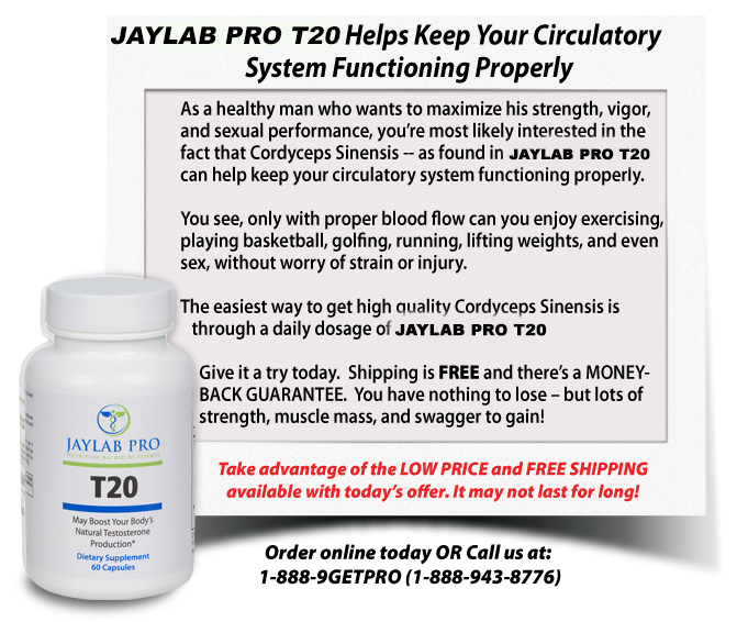 P.S. Times are tough and few of us have money to spend on something we’re not sure will work. That’s why we offer an iron-clad Money-Back Guarantee. If you find that JAYLAB PRO T20 isn’t providing you with the strength and stamina I’ve promised, just let us know. We’ll ask that you return your unused bottles, and we’ll send you your money back. You have my word on it.